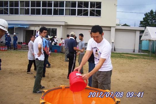 午前9時30分に消防本部より大規模地震により校下付近で被害発生したとの想定で、東陵小学校グラウンドに避難するようにとの有線放送が流れ、グラウンドに集合した住民は各ブロック毎に参加人員報告を行った後、2組に分かれて、同市消防本部の指導による消火器取扱・応急手当・簡易担架製作・心肺蘇生法・AEDの使用方法・バケツリレーによる消化訓練を学びました。並行して婦人部によるカレーの炊き出し訓練も行われ、訓練後参加者全員に振る舞われました。訓練には一川保夫参議院議員、森副市長らが来賓として出席、挨拶しました。