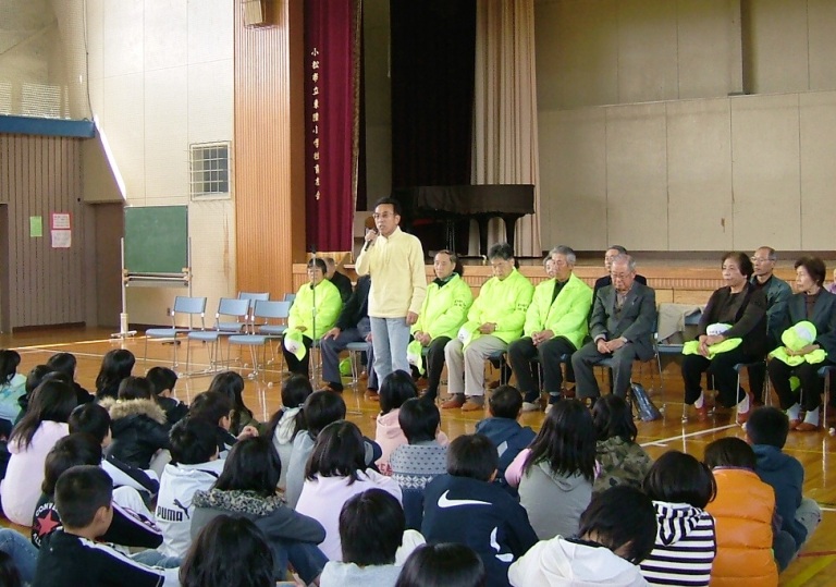 いかない、のらない、おおきな声でさけぶ、すぐ逃げる、しらせるのお話があり、最後に泉校長より「隊員80人で児童200人の安全を見守っています。皆様のお話はとても有意義で参考になりました。隊員の皆様、今日は学校までおいで頂き、本当に有難うございました。」の言葉で閉会、引き続き町別集会で隊員と児童との顔合わせ(児童の自己紹介)、卒業した6年生からのお礼の手紙を児童代表から隊員代表が受取り、隊員、児童が一緒に集団下校しました。