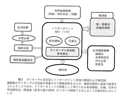 図2はポリモーダル受容器を中心にした鍼灸の作業仮説であるが,そこにはトリガーポイントとツボとの密接な関連と関連痛としてのMPSが描かれている。鍼の刺入はポリモーダル受容器を興奮させ,受容器末端から軸索反射としてcalcitonin
