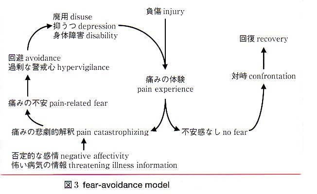modelが参考になる(図3)。人は身体に痛みを感じると、それを何らかの深刻な障害のサインなのではないかと考えて、多かれ少なかれ不安を感じるものである。この不安に対する反応の仕方としては、対時するか逃避するかの2つがある。向き合っていくことができれば、いずれ不安感は減弱していくが、逃避してしまうとその不安感は維持され、次第に増強していく。その結果、患者は身体への注意を過度に集中させ、また身体に害を及ぼす危険性のある行動を控えるようになる。これらが身体能力の低下や障害の増強,抑うつ気分の出現につながっていく。この不安と回避の悪循環の中で痛みが維持されてしまうというのがfear-avoidance