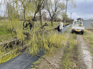 強風後の見回り 3月26日 強風後の見回りを行いました。 1.日時 令和4年4月01日(金)9時~11時 破損した防草シートを撤去しました 倒木が防草シートにかかっていました。倒木の撤去は公園側で実施予定です