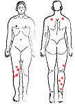 6月、当院受診。膝〜下腿にかけて図のような圧痛点がありました。1ポイントに1〜2tの局所麻酔を注射してレーザー照射。