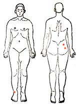 11月29日:初診、腰は軽度の前屈位を保っている。図のような圧痛点あり。60歳代では健常者でも多くの人にヘルニアがみられることを説明し、この痛みは筋筋膜痛であるから治ることを保障する。圧痛点をブロックすると痛みがとれて前屈も少し改善する。投薬なし。