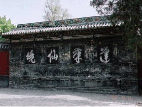 そのお話とは、「唐の時代、科挙試験で上京し、何回目かの落第を喫した盧生は、落ち込んでの帰り道、日が暮れたので邯鄲の、とある旅館に泊ります。旅館では粟のご飯を炊いていて、傍らに仙人の呂洞賓がいました。盧生は出世できない悩みを訴えます。呂洞賓は磁器の枕を渡し昼寝をさせます。盧生は夢の中でまず科挙試験に合格し、のち、金持ちの綺麗なお嫁さんをもらいます。また、皇帝のお目がねに叶い、総理大臣になります。子孫四世代とともに、人間の栄華福喜を五十年間極めます。この時、馬屋で驢馬が吼えるので、びっくりして夢から醒めると、これは一切がただ夢で、自分はやはり貧しい書生で、さきほど炊いていた粟のご飯はまだ煮えきっていません。盧生は人生の虚しさを悟り、出家して仙術を得て仙人になりました。」 写真は「黄梁夢呂仙寺」の前庭の障壁に書かれた「蓬莱仙境」の字。仙人の呂洞賓が書いたということです。離れた所から目をつむつて歩いて、この内の仙の字にたどり着くと、願いが叶うそうです。
