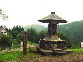 山田温泉から利賀村へ抜ける林道があります。これを行くとすぐ「鎌倉」という部 落の傍を通ります。一寸右へ曲がって寄り道します。この小さな村のはずれに写真の、木を切り抜いた小さなお堂があります。 なかを覗くと石の地蔵さんが見えます。謡曲「鉢木」「藤永」のワキである北條時頼が、諸国回遊の折この地に立ち寄り、故郷に似たこの地を鎌倉と名付け、慕われた村民の為に、自分を模った石像を彫って残していった、と言われています。