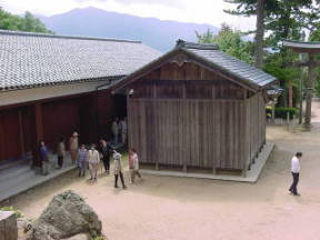 隣の八幡神社にも立派な能舞台が有ります。囲いがされてあって中は覗けません。地謡座が折りたたみ式になっていて、演能の時には引き出せる様に成っています。