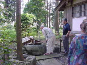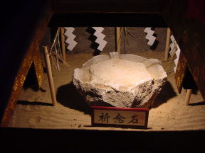 次に訪れたのは、謡曲「鉄輪」のワキである、安倍晴明が住んでいたという「晴明神社」です。平安時代の陰陽師安倍晴明は、990年頃より約5年間敦賀で修行しました。気比神宮の近く相生町にあるこの小さな神社は、晴明が占に使った祈念石がご神体です。祭壇の下に鎮座して居ました。