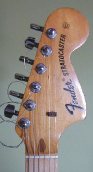 最初に買ったストラトです。オクタ−ブチューニングが合わないので、ブリッジ部分のボディを削ってブリッジを後ろに下げたのですが、いい加減にやったので表面が割れてしまいました。フェンダー弦の紙袋のフェンダーロゴを切り取ってヘッドに貼っています。実にきたないギターですが大事なものです。